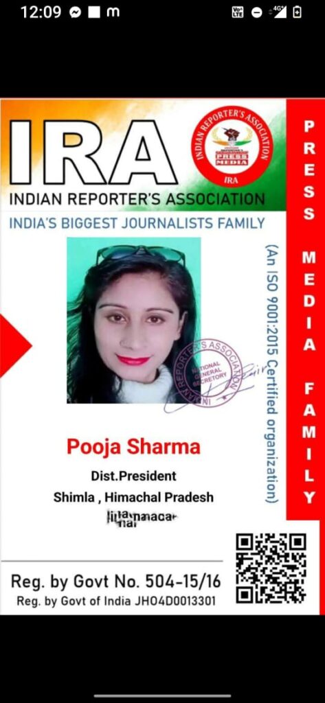 इंडियन रिपोर्टर्स एसोसिएशन द्वारा पूजा शर्मा को शिमला जिला अध्यक्ष नियुक्त