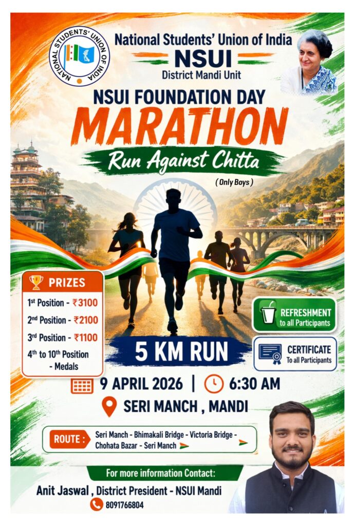 भारतीय राष्ट्रीय छात्र संगठन एनएसयूआई जिला मंडी इकाई द्वारा अपने स्थापना दिवस के उपलक्ष्य में 9 अप्रैल 2026 को “रन अगेंस्ट चिट्टा” मैराथन का आयोजन किया जा रहा है। इस आयोजन के माध्यम से युवाओं को नशे के दुष्प्रभावों के प्रति जागरूक करने और समाज में नशा मुक्त वातावरण बनाने का संदेश दिया जाएगा।
